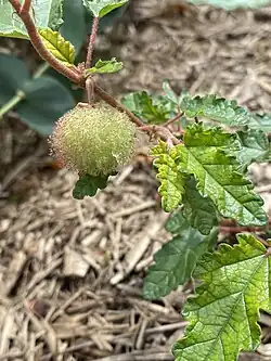 Androcalva rosea is a small, mostly prostrate shrub 0.1–0.3 m (3.9 in – 11.8 in) high with branches up to 60 cm (24 in) long. The branches are thickly covered with star-shaped hairs, especially on new growth, later nearly hairless and surface becoming rounded. The leaves are narrowly egg-shaped or oblong, 24–70 mm (0.94–2.76 in) long, 8–17 mm (0.31–0.67 in) wide with star-shaped hairs on both sides with a petiole 4–10 mm (0.16–0.39 in) long. The leaf margins are scalloped and leaves rounded at the apex. The inflorescence consists of 1-3 pink flowers with five lobed petals on a stalk 2–8 mm (0.079–0.315 in) long that is densely covered with star-shaped hairs. The 5 pink calyx lobes are densely covered on the outer side with star-shaped hairs. The fruit are light green ageing to pale brown, globular shaped, 10–16 mm (0.39–0.63 in) in diameter and thickly covered with straight, stiff hairs 2–4 mm (0.079–0.157 in) long. The dark brown seed is 1.5–2.5 mm (0.059–0.098 in) long. Flowering occurs from August to February.[1][3]