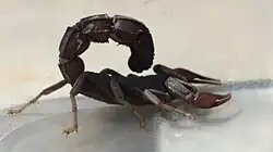 Scorpions can eat many kinds of insects, spiders, lizards, small mammals such as mice, or even other scorpions.[9] Scorpions are able to go months without consuming food.[9] Prey is captured and crushed by its pincers, while their stingers are used to inject venom into their prey.[9] This paralyzes the prey, causing immobility and allowing the scorpion to consume it with ease.[9] Scorpions use their chelicerae (small claw-like structures attached to their mouths) to pull small parts off their prey, this is simple for them as chelicerae are quite sharp.[9] Scorpions are only able to ingest liquids, thus their chelicerae help them dispose of solid parts that cannot be consumed.[9]