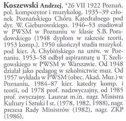 Andrzej Koszewski (Poznań, 26 July 1922 – 17 February 2015) was a Polish composer, musicologist and teacher.[1][2] His students included Lidia Zielińska, Krzesimir Dębski and Bettina Skrzypczak.