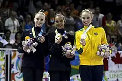 Kvieczynski went to the 2011 Pan American Games, held in Guadalajara, where she won a silver medal and three bronze medals.[9] Her first bronze medal was won on October 15, 2011 in the all-around competition.[10] She won three more medals on October 17, 2011, one bronze in the ball final[11] and another in the hoop final,[12] as well as a silver medal in the club final.[13] At the 2014 World Championships, she only competed with the hoop and ball due to an administrative error preventing her from registering for all events. She placed 35th with the hoop and 38th with the ball, the best placements of the Brazilian gymnasts at the event.[14]