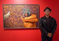 On March 31, 2023, Rodríguez-Díaz died in San Antonio at age 67, survived by his husband Briseño. The photographic quality of Rodríguez-Díaz's paintings and his propensity for self-portraiture were noted. Artist and professor Ricky Armendariz said "He was literally one of the most talented — technically and conceptually — artists that I've ever met, bar none...His work was hard hitting at times. His work was about identity, pain and loss."[4] After hearing of his death, Cisneros called Rodriguez-Diaz "a gentleman and a genius."[50] Curator Ruben C. Cordova said he created "uniquely original works by using self-portraiture as a vehicle for social criticism."[51] Many of his paintings have political or social content, which cover a range of topics, including ecology and the U.S. oil industry, American imperialism, war, social inequality, cultural invisibility, and attitudes towards people living with HIV.[5][51]