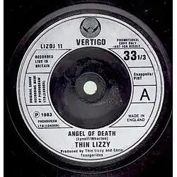 "Angel of Death" is a song by rock band Thin Lizzy featured on their Renegade album,[1] released as a single in the United States. The tune peaked at No. 38 on the Mainstream Rock chart.[2] The song was a collaboration between band leader Phil Lynott and Darren Wharton, who had joined the band as a keyboard player in 1980. Angel of Death was premiered live in August 1981 when its lyrics were rather different from the later released versions.[3] The opening number of Thin Lizzy's live set during the Renegade world tour of 1981/2 when it heralded the band on stage with the sound of air-raid sirens, Angel of Death was also an integral part of the Thunder and Lightning live set in 1983.