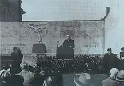 In 1953 the commemoration of the national day of mourning took place in smaller form at the Angel of Peace. Before the Memorial Day in 1954, the soldiers' and returnees' associations clearly stated that they did not want to be mentioned at the ceremony together with the Jews and other victims of National Socialism. When the city administration learned that the soldiers' associations were preparing a big ceremony in the cemetery, they cancelled the event at the Angel of Peace in order not to intensify the separation. In the following years, the memorial service, which was initially organized by the Volksbund alone, received an increasingly military character. From 1958 the city, the Volksbund and the Arbeitsgemeinschaft soldiatischer Verbände, to which the Hilfsgemeinschaft auf Gegenseitigkeit der Angehörigen der ehemaligen Waffen-SS (HIAG) belonged, jointly invited to the event at the cemetery.[17] For the historian Christian Peters, it is "more than just a nuisance" that former members of the Waffen-SS called on the Mannheim population and thus also survivors of the Holocaust to an event at which the victims of persecution and resistance were also remembered.[18]