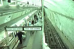 As with many of the C&SLR's stations, it was originally built with a single central island platform serving two tracks in a single tunnel[11][12][13] – an arrangement still seen at Clapham North and Clapham Common. Access to the platforms from street level was via three Euston Anderson electric lifts before the rebuilding of the station. When the C&SLR line was closed for tunnel reconstruction in the early 1920s to accommodate larger trains,[8] the station façade was reclad with tiling and the lifts were replaced by new ones from Otis.[10]