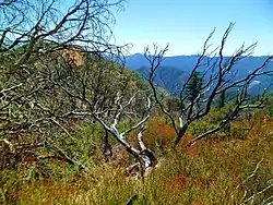 ![]() The San Gabriel Mountains, part of the Angeles National Forest. The southwest view from Islip Saddle shows Bear Creek, a tributary of the San Gabriel River that lies within the San Gabriel Wilderness, and Twin Peaks (7,761 feet (2,366 m)). | |