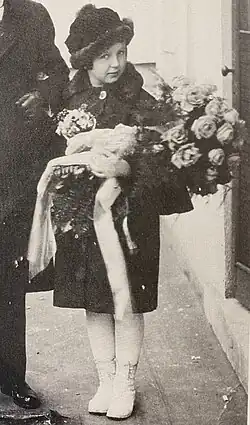She arrived, with her father, at the North Carolina Executive Mansion in a limousine and, upon exiting the car, ran up the steps to the mansion to hug and kiss the outgoing Governor and First Lady, Thomas Walter Bickett and Fanny Yarborough Bickett.[1] After the meeting at the mansion, she attended the governor's inauguration ceremony at Raleigh Memorial Auditorium, arriving on the arms of her father and Governor Bickett.[1] Harris wore a brown velvet dress, coat and hat with matching kid gloves, and a corsage of sweet peas and lilies of the valley for the occasion. Following the ceremony, her father handed her a bouquet of American Beauty roses that was presented to him by a group of women from Charlotte.[1]