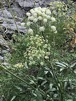 Angelica breweri is a species of angelica known as Brewer's angelica. It is native to the high mountain ranges of eastern California and far western Nevada, where it grows in coniferous forests. This is a taprooted perennial herb producing an erect, hollow, hairy stem to heights between 1 and 2 meters. The large leaves are composed of many highly dissected leaflets, each up to 10 centimeters long. The inflorescence is a compound umbel with up to 50 long rays holding clusters of hairy white flowers. The base of each pedicel has a thick webbing. The fruit is a pair of ribbed bodies, each containing a seed.