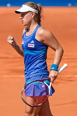 Kerber was unseeded in Stuttgart to open her season on red clay, and defeated Alexa Glatch in straight sets, before upsetting three-time defending champion Maria Sharapova in three sets.[95] In the quarterfinals, she saw off Ekaterina Makarova, before beating Madison Brengle to reach her second final of the year. There, she fought back from a set and 5–3 down to prevail over Caroline Wozniacki, thus scoring her fifth career title, also her first on home soil, which saw her extend her winning streak on clay to 11 matches.[96] That streak, however, expired in the hands of Stosur in the opening round of Madrid. At the Italian Open, Kerber reached the second round after defeating Alizé Cornet but lost to Begu once more. After a semifinal run in Nuremberg, Kerber exited the French Open in the third round from a set up, in the hands of Garbiñe Muguruza.[97]