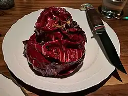 The building contains dark wood and brick walls, with a view overlooking the Bay Bridge.[1] Being "microclimate-oriented" and "sealife-focused",[1][2] Angler's menu includes a radicchio with XO sauce made from radicchio leaves, a tuna with tomato jam, fried blowfish tails, potatoes with a light cheese sauce, and a sundae with caramel, smoked salt, and cocoa;[3] drinks include wine and cocktails, such as the Don Lockwood, consisting of scotch, maple, and bourbon, and the Cutloose, consisting of gin, passionfruit, and orange.[1][3]