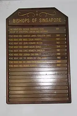 The Bishop of Singapore is the diocesan bishop for the Anglican Diocese of Singapore, founded in 1909.