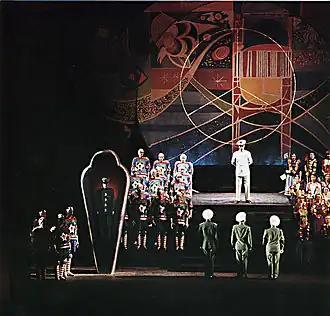Many representatives of the international press were at the Royal Swedish Opera in Stockholm for the premiere in 1959 at a time when the space age was beginning.[2] Blomdahl said in interview that the opera (in common with his next opera Herr von Hancken) was founded on "modern man's complexity and his basically impossible situation"; Aniara dealt with "the downfall of the group".[3] The score of Aniara is varied and makes full use of a range of musical idioms, including jazz, serial writing and an electronic tape. The narrative is sung primarily by Mimaroben, a bass-baritone, who operates the electronic tape, Mima, the computer, and by the chorus.[1] In essence the opera (and poem) deal with the relationship between the individual and the group through time. Erik Lindegren had seen a stage performance a few years before by the deaf-mute priest S. G. Svenfors and, deeply moved by its expressivenes, engaged Svenfors to teach Ulfung to perform the Deaf-Mute's 'song' in sign language, one of the dramatic high points of the opera.[4]