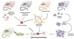 | Pten-induced kinase 1 (PINK1 gene) | recessive familial PD | Genetic | -dysregulates mitochondrial function