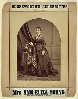 Ann Eliza Young (September 13, 1844 – December 7, 1917) also known as Ann Eliza Webb Dee Young Denning[1] was one of Brigham Young's fifty-six wives and later a critic of polygamy. Her autobiography, Wife No. 19,[2] was a recollection of her experiences in the Church of Jesus Christ of Latter-day Saints (LDS Church). She grew up in a polygamous household that moved to Utah during the Mormon migration. Ann Eliza was married and divorced three times: first to James Dee, then Young, and finally Moses Denning. Her divorce from Young reached a national audience when Ann Eliza sued with allegations of neglect, cruel treatment, and desertion. She was born a member of the LDS Church but was excommunicated shortly after her public divorce from Young.