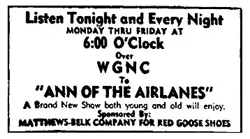 2. ^ a b Schadow, Karl (October 2015). "Radio Recall: Ann of the Airlanes". www.mwotrc.com. Metropolitan Washington Old-Time Radio Club. Retrieved January 31, 2016.