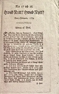 Hvad nytt, hvad nytt? was a popular paper which included news and politics as well as cultural topics and was published two or three times a week, at that time a good number. Several of the most famed writers of the Gustavian age were published in the paper: Bengt Lidner and Anna Maria Lenngren (1775) both debuted there. Despite her success, she officially commented on its success with customary humility, replying that she herself doubted that a paper published by an uneducated female was much worth having.