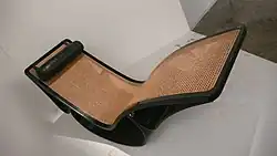 The Niemeyers' most important design was the "Rio", a chaise longue designed in 1970 for her father's personal use.[16][17] Using the curves favored by her father, reminiscent of the coastline of his native Brazil and the figure of a woman, the frame was made of three curved elements to give balance and create the structure of the chair. The main support allowed the chair to rock and provided balance, while the smaller elements braced the head and foot of the seat. The shaped plywood was stained with black lacquer and the cylindrical headrest affixed by two cords was made of black leather.[17][18] Tensioned wicker of woven natural cane stretched over the frame to form the seat of the rocker.[16][17] The chair did not go into production until 1978, when it was made in Brazil at the Tendo plant.[17]