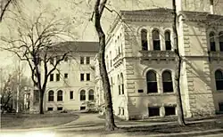 The school was located at 14th and Marion Streets in Capitol Hill. Built in 1898, perhaps by Frederick Sterner, it was a Renaissance Revival style building with round arched windows and balconies.[5] The school had large classrooms, a music room with a pipe organ, an auditorium, a swimming pool, a bowling alley, and dormitories.[3] In 1906, a three-story addition was added with an alley bridge from the main building, that looked like a Venetian bridge. There were then a total of three buildings.[5] Then, the trustees added a park and clubhouse by 1910.[7]