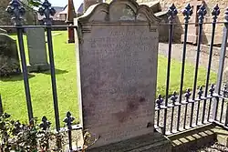 Erected by GILBERT BURNS, factor at Grants Brae in memory of his children ISABELLA who died 3 July 1815 in the 7th year of her age, AGNES who died 11th Sept 1815 in the 15th year of her age, JANET who died 30 Octr 1816 in the 18th year of her age. And of his mother, AGNES BROWN who died 14 Jany 1820 in the 88th year of her age; whose mortal remains lie all buried here. Also of other two of his children viz. JEAN who died on 4 Jany 1827 in the 20th year of her age and JOHN who died on the 26 Feby 1827 in the 25th year of his age. GILBERT BURNS thier [sic] father died on the 8 April 1827 in the 67th year of his age. Also buried here, ANNABELLA, sister of Gilbert Burns, who died March 2, 1832 aged 67.