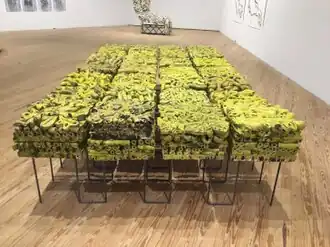 In the mid-2000s, Rosen turned to more loosely composed pieces she called "mash-ups" and "bundled constructions," which ranged from pedestal- (e.g., Squill, 2006–7) to human-sized.[40][36] Reviewers noted the wide range of natural and cultural associations the sculptures conjured—scholars rocks and garden gnomes, barnacles proliferating on rocks, beehives, alien plants or ritual objects.[36][1][39][6] The larger works typically consisted of numerous, individually modeled biomorphic elements, piled and bound together with wire or rubber strips and seemingly about to topple, which were held upright by tall metal armatures resting on casters, like wheel carts.[1][43][39] Their rounded, globular forms—alternately wormlike, bulbous, knobby, vegetal or organ-like—were often glazed in vivid shades of green and yellow, and in some cases intertwined with black and white tubular shapes in notably asymmetrical assemblages.[1][2][6]