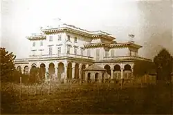 Front facade of the main house. Two human figures under the far left arch of the front porch give an indication of scale.