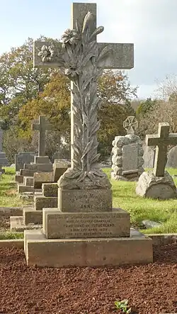 She died at the family's London mansion, Stafford House, St James's,[6] and was buried at the Extra Mural Cemetery (now Barton Road Cemetery or "The Old Cemetery"), Torquay in section D (grid ref: 50.484307, -3.542972). An ornate cross mounted on a three step plinth has the following inscriptions: In Loving Memory of Anne (top step). Duchess of Sutherland Countess of Cromartie Wife of George Granville Third Duke of Sutherland Born 21 April 1829 Died 25 November 1888 (middle step). For God so loved the world that he gave his only begotten Son that whosoever believeth in Him should not perish but have everlasting life. Looking to Jesus the author and finisher of our faith (bottom step).
