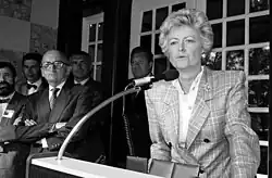 She was the President of the General Council of the French department of Calvados.[5] She has been President of the department since 1991. She was a member of the Union for French Democracy (UDF) until the UDF dissolved in 2007, and she did not join either of the UDF's claimed successors: the New Centre and the MoDem. Unlike most centrists, she supported Nicolas Sarkozy by the first round of the 2007 election, over UDF candidate François Bayrou. However, she is not a member of Sarkozy's Union for a Popular Movement (UMP).