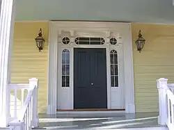 A full-length, one-story portico graces the front façade. The portico was completed in 2009, and its design is inspired by the one found on the front façade of Cherry Hill (Warren County, North Carolina), which was built by John A. Waddell, a Jacob W. Holt-school builder.[19] The portico features a bracketed cornice, a balustrade which creates a balcony accessible from double doors in the central bay of the second floor, and is supported by six sets of square, fluted columns.[20] The house's main entryway is located in the central bay of the front façade, and consists of a pair of paneled doors surrounded by unique sidelights and a transom punctuated by circular “pinwheel” windows in each corner. This entryway is identical to that of Vine Hill (Franklin County, North Carolina), which was built by Jacob W. Holt in 1856.