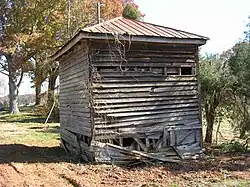 Smokehouse, c. 1858. Measuring approximately 14 by 14 feet, the smokehouse is clad in weatherboard and covered by a pyramidical roof of standing seam, galvanized metal (a later replacement). The board-and-batten entry door is located on the east façade. The interior exhibits the building's timber-frame construction, and a wooden floor is broken in the center by a sunken firepit.