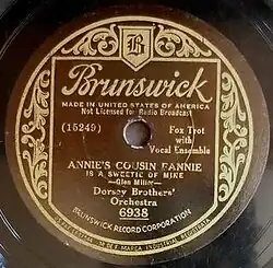 Annie's Cousin Fannie,[1] also released as "Annie's Cousin Fannie is a Sweetie of Mine", was written for the Dorsey Brothers Band in 1934 by Glenn Miller, who was an arranger and trombonist in the band. The composition featured double entendre lyrics.[2]