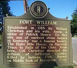 William Christian acquired land claims in Kentucky in payment for his service during the French and Indian War (also known as Seven Years' War). There were also people moving to the frontier of what is now Kentucky following the American Revolutionary War.[3] William had a zealous interest in moving to Kentucky; Christian acquiesced to his decision. As was common for the time, women generally had a lack of influence on decision-making.[4]