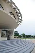 According to Bruce Brooks Pfeiffer (a Wright scholar and original archivist of the Frank Lloyd Wright Archives), "When he received a commission for a church for the Milwaukee Hellenic Community, Wright consulted his wife, who was brought up in the Greek Orthodox faith, about the predominant symbols of the church. 'The cross and the dome,' was her reply."[2] These two architectural forms dominate the design. The floor plan itself is a Greek cross. Wide arches support the upper level, or balcony. The roof dome sits atop an inverted dome, or bowl. Through simplification and abstraction of the forms, Wright succeeded in artfully translating the cross and the dome from their historical Byzantine context to the vastly dissimilar setting of the twentieth-century American Midwest. Much of the building utilizes a gold-anodized aluminum which, at the time, was a new material that Alcoa established. Since its construction, there have been a few renovations due to structural problems—including the replacement of the dome's original exterior tile to a synthetic plastic resin.[3]