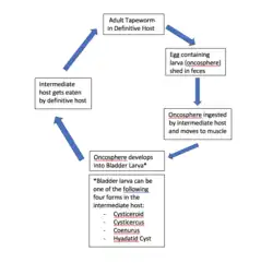 This parasite follows the general Cyclophillidean life cycle diagrammed in Figure 1. These parasites prefer rich, grassy areas and are not often found in arid, desert climate areas such as Arizona. This life cycle is indirect, and requires an intermediate host, typically an oribatid mite which lives on vegetation. The eggs from the adult worms are passed in the feces into the pasture which the mite then consumes. While in the mite, the eggs develop into larvae until this mite is consumed by a horse eating grass.[3]
