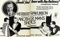 Another Man's Shoes is a 1922 American comedy film directed by Jack Conway and written by Victor Bridges, Raymond L. Schrock, and Arthur F. Statter. It is based on the 1913 novel Another Man's Shoes by Victor Bridges. The film stars Herbert Rawlinson, Barbara Bedford, Una Trevelyn, Nick De Ruiz, Josef Swickard, and Jean De Briac. The film was released on November 6, 1922, by Universal Film Manufacturing Company.[1][2][3]