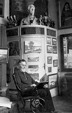 The house in Balkūnai where Žmuidzinavičius grew up was turned into a memorial museum in 1982 by his nephew the theatre historian Vytautas Maknys.[28] The museum displays restored furniture, photos, paintings, and other material related to the family.[29] Until 2017, the museum organized an annual amateur theatre festival.[30] The house where Žmuidzinavičius was born in Seirijai was demolished in 1938 but its location is marked by a 1.3-metre (4 ft 3 in) tall memorial stone erected in 1976.[31] In 1986, a room-museum dedicated to Žmuidzinavičius was opened at the high school in Seirijai.[32] The school was renamed in his honor in 1989.[33] In 1949–1966, Žmuidzinavičius spent summer vacations in a wooden villa in Palanga. The house, built by Graf Feliks Tyszkiewicz, was added to the Lithuanian Registry of Cultural Heritage in 1993.[3]
