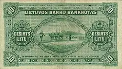 In 1919, Žmuidzinavičius participated in the plans to launch the national currency to replace the ostmark and ostrubel. He created drafts of the new banknotes (called muštinis) and travelled to Sweden to negotiate the printing, but the plans were abandoned.[2][20] Instead, Lithuania introduced the gold-backed Lithuanian litas in 1922. It is very likely that Žmuidzinavičius participated in the design of the first litas banknotes as they bear the coat of arms of Lithuania that is very similar to Žmuidzinavičius' version.[20] In 1927, Lithuania redesigned litas banknotes and Žmuidzinavičius was asked to design the 10 litas banknotes that would depict a Lithuanian village. He based his design on a photo by Antanas Tamošaitis of his brother sowing grain in spring.[20]