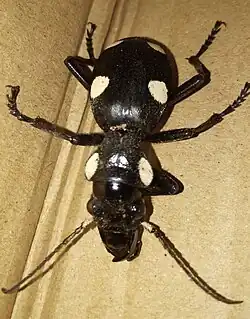 Adults measure approximately 4 cm (1.5 inches), are black with six relatively large, white, dorsal spots (four over the elytra and two on the thorax). Other patterns are possible although the pattern is always symmetrical.