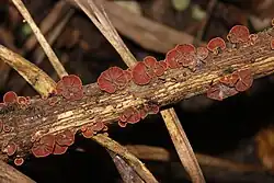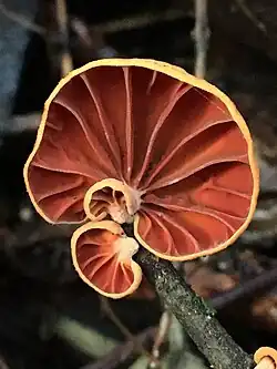 Fruit bodies are rust coloured to dark red, and are fan shaped. They grow in groups on dead twigs.[6] Caps are on average 3–20 mm (0.1–0.8 in) diameter.[7][2] Horizontal caps are attached laterally to substrate and are sessile with a very small thickened stem like point. Shapes range from reniform to almost circular, convex,[6] and almost symmetrical, deeply grooved radiating from point of attachment, following gill outline [7] Pileus is coloured creamy pale pink to reddish brown, and smooth, when young covered in scaly whitish dust.[4] Gills are orange to brown, widely spaced,[3] and radiating from the pale, thickened point of attachment to the substrate.[6] Spores are translucent, 7.5–12.5 μm long, and 5–8 μm wide,[3][7] with a white spore print. Context is 1–2 mm (0.04–0.08 in) thick, and pale with a thickened wall.[4]