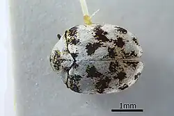 This beetle is 2 to 3.5 millimeters long and round in shape. It is black with variable patterns of white and yellow mottling. The legs are covered in yellow scales. It looks similar to other carpet beetles, but its tiny body scales are rounded or oval, while those of other carpet beetles are longer and narrower.[1] Each antenna is tipped with a club.[2]