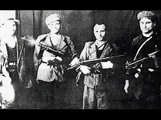 It didn't take long before information about the partisans actions reached the NKVD, but after an operation in August, Ion Bors was the only one of all the members of the group to be caught. Under the guise that he will help them to get their hands on the others, he is let free, only he will not respect this agreement and will join the pursuit. The secret police lose their trail, if only briefly. Meanwhile, the number of Black Army partisans was growing. Gavril Bodiu, who had killed a Soviet tax collector in an altercation, found refuge among them. It was he who would take command of the group in the first months after its foundation. Other notable members who join them in this period are Gheorghe Bogatu and Vasile Padure, the latter making a spectacular escape from militia custody. The NKVD agents manage in the meantime to track down the partisans again, only this time they do not rush. It was not until October 1949 that a major action took place, in which the movement's leader, Gavril Bodiu, was killed.[9]