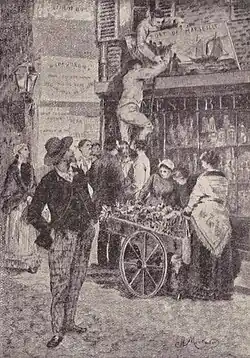 Chintreuil may once have broken this rule, if inadvertently. According to Georges Montorgeuil, the chapter "Passage de la mer Rouge" in Murger's novel was based on Chintreuil.[10][11] The character Marcel, after repeatedly submitting his painting The Passage of the Red Sea to the Paris Salon and repeatedly being rejected, at last agrees to sell it to a dealer in second-hand goods for 150 francs and a lobster dinner. A week later, he and his friends see the painting, not in an art gallery, but hung as a signboard above a shop. When the painting receives applause from admiring onlookers, Marcel is thrilled.