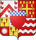 - Français : Écartelé : 1, d'argent, au chevron de gueules, accompagné de 7 merlettes du même (4 et 3). (d'Aumont) ; 2, de gueules, à la croix fleurdelisée d'or, cantonnée de douze billettes du même (de Villequier) ; 3, contre-écartelé, aux 1 et 4, de (Chabot); au 2, d'argent, au lion de gueules, armé, lampassé et couronné d'or, la queue fourchée et passée en sautoir (Luxembourg); au 3, de gueules, à l'étoile à seize rais d'argent (Baux). (Alias: Marquis de Mirebeau, comtes de Charny etc ... mêmes armes.) ; 4, fascé-nébulé d'argent et de gueules (de Rochechouart) ; sur-le-tout de gueules, au chef échiqueté d'argent et d'azur (de Rochebaron).[10]