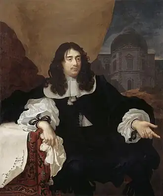 - ^ The subject of this portrait was identified as Louis Le Vau in 1955 by Albert Laprade, who recognized the plan as that of the southwest corner of the old Louvre, that is the Bathing Apartment of the Queen Mother Anne d'Autriche, remodeled by Le Vau in the summer of 1661, and the building illustrated in the background as the pavilion at the north end of the Louvre's Petite Galerie (see Galerie d'Apollon), constructed after the fire of 1 February 1661 (see also Laprade 1960, chapter 3, plate 1).