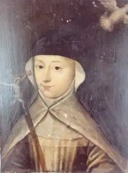 Antoinette d'Orléans-Longueville spent another three years in Machecoul to defend the interests of her sons, Henri (now the direct heir to the Duchy of Retz ) and Léonor (who died soon thereafter in 1600), and left their education to governesses, tutors and their grandparents.[2] Then, in 1599, she decided to "rebuild her life" at age 27. She learned of the existence of a new monastery, "a refuge for noble widows and orphans of war, run by the reformed Cistercian monks" and joined the Feuillantines convent near Toulouse as Sister Antoinette of Saint Scholastica.[3][4][5]