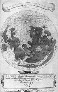 Schyrleus also included a map of the Moon in Oculus Enoch et Eliae. It was the first depiction of the Moon as seen in an inverting telescope (and thus the Moon itself is inverted in the illustration, with the South Pole at the top). The crater Tycho, for example, was depicted on lunar maps as early as 1645, when Schyrleus depicted the bright ray system. His map, however, did not come into standard use, as it was superseded by those made by Hevelius and the Jesuits Giovanni Battista Riccioli and Francesco Maria Grimaldi (1650–1651). In 1647, Schyrleus published a lunar chart with a diameter of 19 cm.[4]