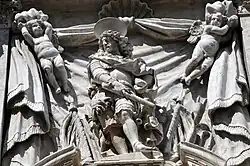 A statue of Antonio Barbaro is in the middle of the façade.[1] It was damaged by lighning in 1759.[4] Statues of Antonio Barbaro's four brothers flank his, two on each side. .[2] Other statues portray allegorical figures of Hunger, Honor, Virtue, and Wisdom.[10] All of the statues are probably the work of Josse de Corte.[1] The Barbaro coat of arms, as well as the four cardinal virtues are also depicted.[1]