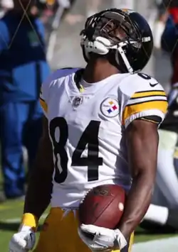 In the season-opener against the Cleveland Browns, Brown recorded 182 receiving yards on 11 receptions as the Steelers won on the road by a score of 21–18.[171] His 182 receiving yards led all NFL receivers for the season opening week.[172] In addition, he caught all 11 of his targets, which marked a career-high in terms of receptions with a 100% completion rate.[173] During a Week 4 26–9 road victory over the Baltimore Ravens, Brown became angry over not being thrown the ball by Ben Roethlisberger on an incomplete play, and was filmed throwing a Gatorade cooler and yelling at coaches.[174] During Week 11 against the Tennessee Titans, Brown made a one-handed catch adjacent to his helmet in the end zone for a touchdown. Overall, he had 10 receptions for 144 yards and three touchdowns as the Steelers won 40–17.[175][176] Brown joined John Stallworth as the only Steelers player with two career games with at least three receiving touchdowns.[177] For his performance in Week 11, Brown was named AFC Offensive Player of the Week.[178] In the next game against the Green Bay Packers, he had 169 receiving yards and two touchdowns, including two sideline receptions for 37 yards in the final 17 seconds to set up the game-winning field goal.[179] Brown became the fifth player since the 1970 merger with four games with at least 150 receiving yards in the first 12 weeks of a season.[180] Plagued with a minor toe injury,[181] in Week 14 against the Ravens, Brown finished with a season-high 213 receiving yards on 11 receptions, helping the Steelers narrowly win 39–38 and clinch the AFC North title.[182] His 213-yard performance marked the second time in his career with at least 200 receiving yards in a single game.[183] During Week 15 against the New England Patriots, Brown left the game with a left calf injury, and was taken to the hospital. Shortly after the Steelers' 27–24 loss to the AFC East-clinching Patriots, it was revealed that Brown's left calf was partially torn, meaning that he would not play for the rest of the regular season, but would return during the playoffs.[184] He returned in the Divisional Round of the playoffs, recording seven catches for 132 yards and two touchdowns as the Steelers lost to the Jacksonville Jaguars by a score of 45–42.[185]