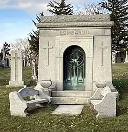 Lombardo, however, refused to resign and continued to organize civic projects under the Unione Siciliana until shortly before his death on September 7, 1928. Lombardo was gunned down, along with his bodyguard Joseph Ferrara (although bodyguard Joe Lolordo survived), allegedly by an alliance of the Joe Aiello Gang and the North Side Gang, at the intersections of Madison Street and Dearborn Street.[3] It was said that Moran ordered this death and had his two experienced gunman do the job with the help of Aiello. Thought to be retaliation for the murder of Frankie Yale the previous July, Lombardo's death was in turn soon avenged with the murder of members of the Joe Aiello Gang and the St. Valentine's Day Massacre, in 1929. He is buried in Mount Carmel Cemetery in Hillside, Illinois.