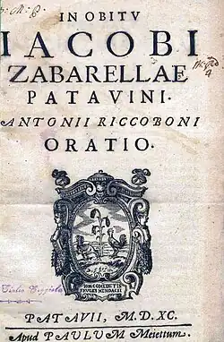 - Riccoboni, Antonio (1590). In obitu Iacobi Zabarellae (in Latin). Patavii: apud Paulum Meiettum.