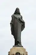As a memorial of the 24th International Eucharistic Congress held in Malta in 1913, Sciortino was commissioned to complete a monument. This work, entitled "Christ the King", was unveiled in Floriana on 30 December 1917 during a religious ceremony which around 40,000 Maltese attended. The statue of Christ the Redeemer is a bronze figure 3.5 meters high that dominates on a granite pedestal and expresses the majesty and greatness of a king. Malta is represented as a female figure kneeling under the pedestal in an act of submission while asking for a blessing. The figure also recalls the victories over "the enemies of Christ". Originally, Sciortino planned the monument with a figure of Christ only because the main goal was a representation of transubstantiation, the concept of the real presence of Christ in the Holy Eucharist. For this, the figure of Malta does not look at the face of Christ but instead bows her head in an act of reverence bringing before her eyes the image of the body and blood of Christ.