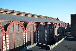 During World War II, severe damage was inflicted to the train hall by the impact of V-2 rockets, though the structural stability of the building remained intact, according to the National Railway Company of Belgium.[2] Nevertheless, it has been claimed that the warping of the substructure due to a V-2 impact had caused constructional stresses.[3] The impact remains visible due to a lasting wave-distortion in the roofing of the hall.[2]